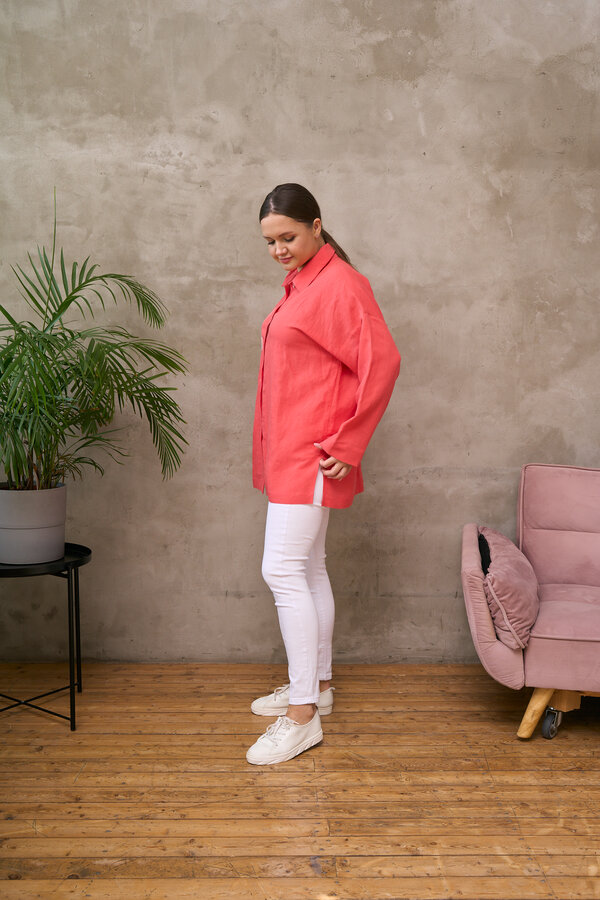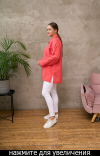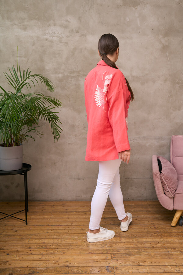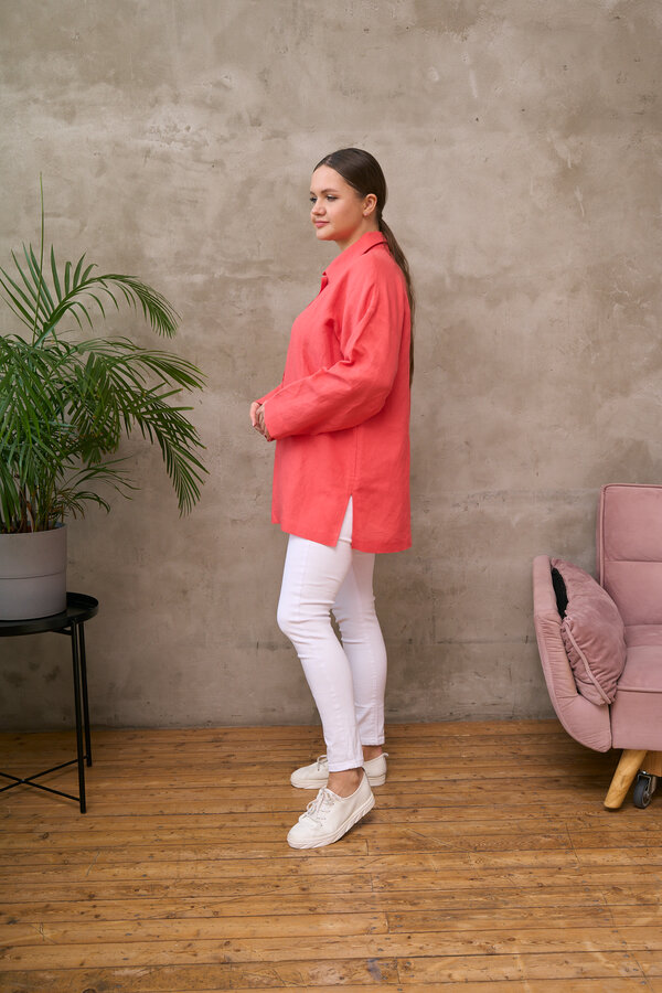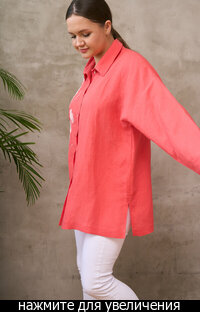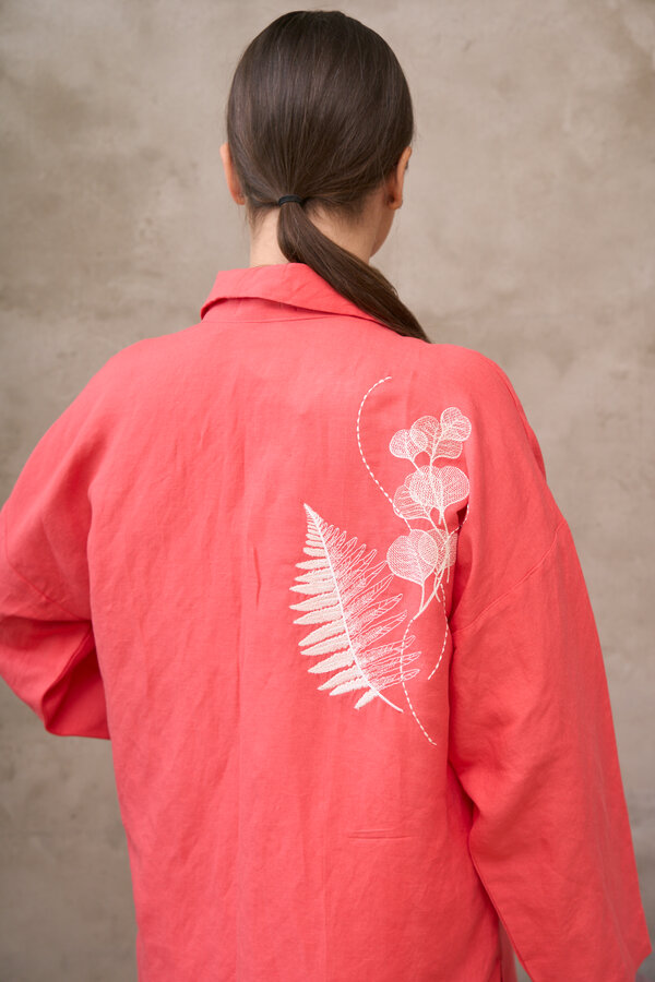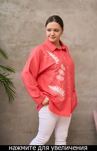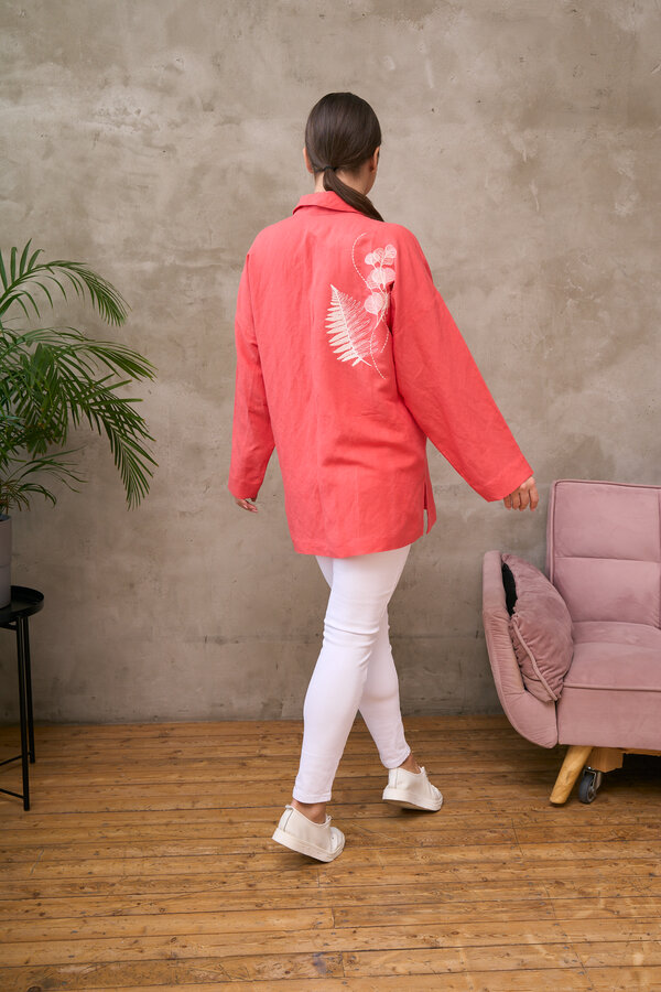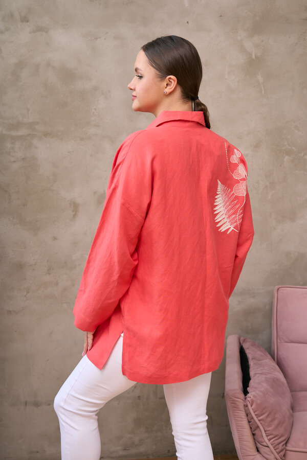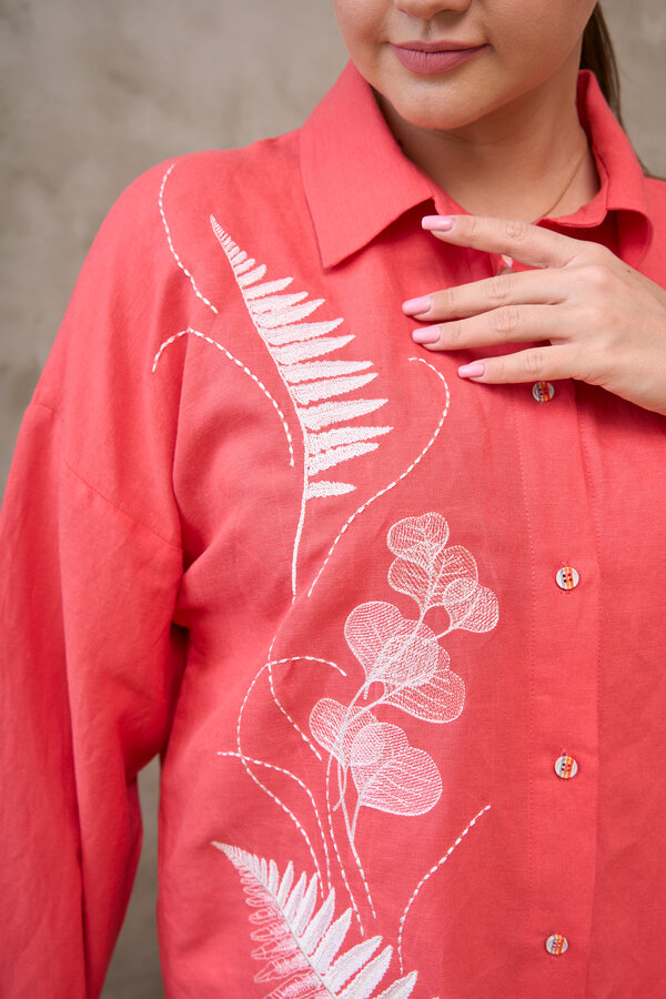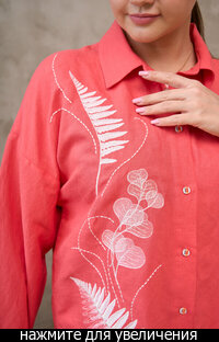 Сейчас: Работаю ]Удлиненная рубашка свободного кроя выполнена из тонкого льна с вискозой приятного кораллового цвета с большой вышивкой "Папоротник".