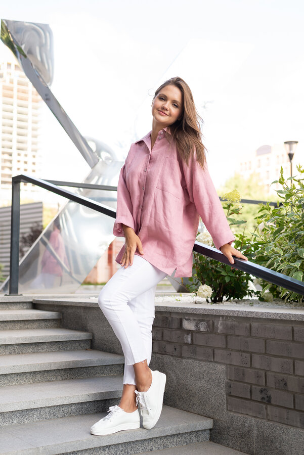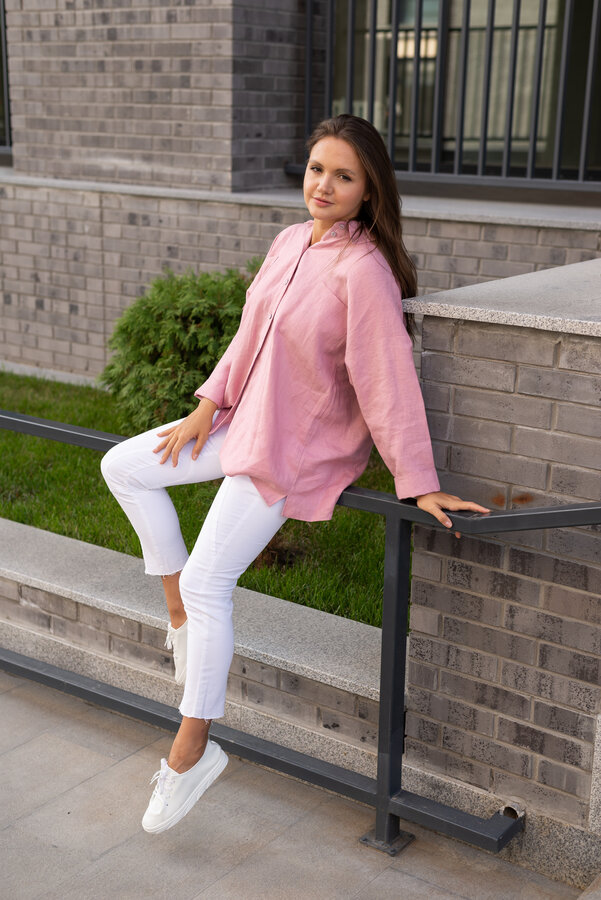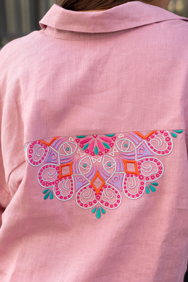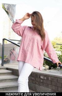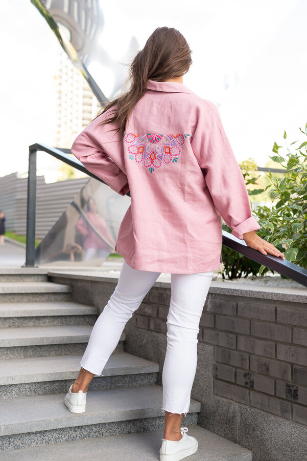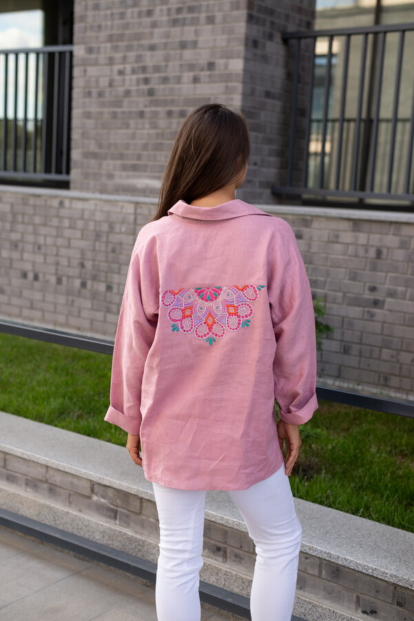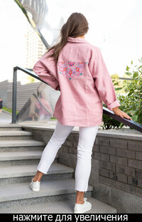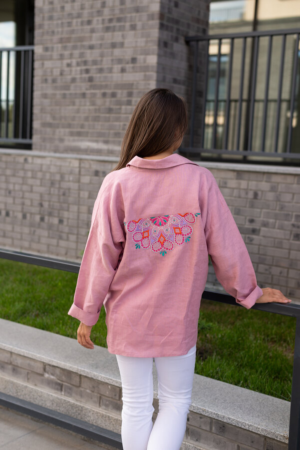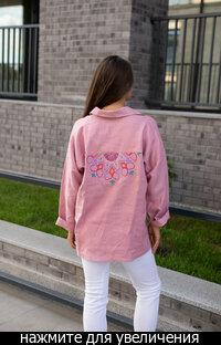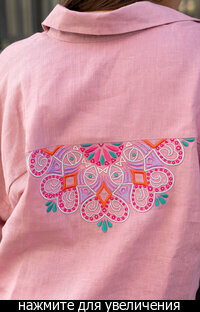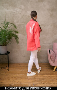 Сейчас: Работаю ]Удлиненная рубашка свободного кроя выполнена из тонкого льна с вискозой приятного кораллового цвета с большой вышивкой "Папоротник".