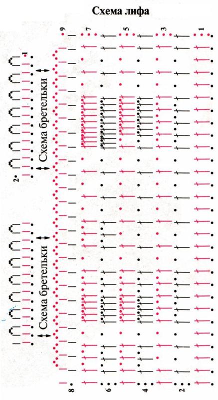 Вторую бретельку вязать аналогично, начав с 21-24 столбиков 1 ряда и присоединив к 29-32 столбикам 1 ряда.