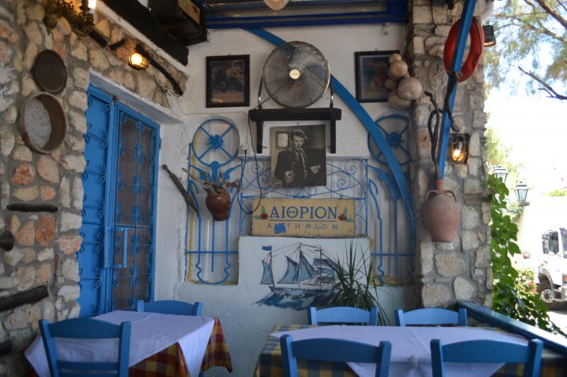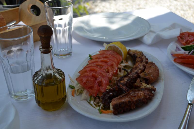 Осьминожки на гриле, сувлаки, гирос с джаджикой, настоящий греческий салат с вкуснейшей фетой, рыбка дорада или любая другая приготовленная с оливковым маслом и политая соком лимона, с рециной или вином тцантали или еще лучше с домашним вином хозяина таверны. Всё очень вкусно !
