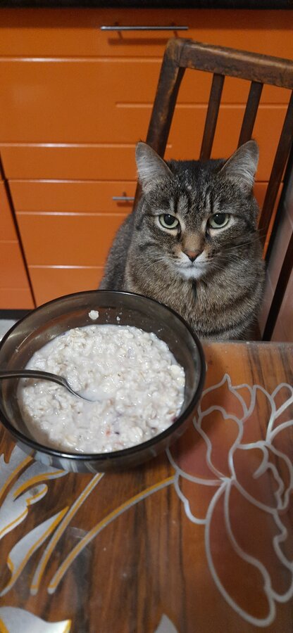Сядь, человек. Зачем ты поставил чашку с кашей на стол? Не видишь, котику неудобно?